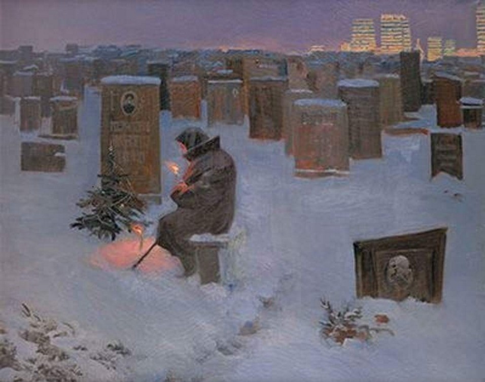 Всі, хто знав твій голос, твої звички, твої жарти. Всі, хто знав чому ти радий, а що тебе засмучує. Всі вже пішли. І тепер ти один. І що залишається, окрім того, як в найсвітліше свято прийти туди, де коханий? На самоті вбрати маленьку ялинку, на самоті запалити свічки і бути там, з коханою людиною, або хоча б з пам’яттю про нього. І ці маленькі вогники від свічок куди сильніше зігрівають, ніж вогні великого і далекого міста, яке десь далеко. Ми всі стали самотніми в боротьбі за статус, за блага. Так ми втрачаємо тих, з ким могли б розділити радість, а потім у нас вже нічого не залишається. Лише тільки ти один і навколо тебе самотній світ. Чи варте воно того? А може на цій картині мати прийшла на могилу до свого єдиного сина? Заради нього жила, а тепер залишається жити просто день за днем, сенсу більше немає.